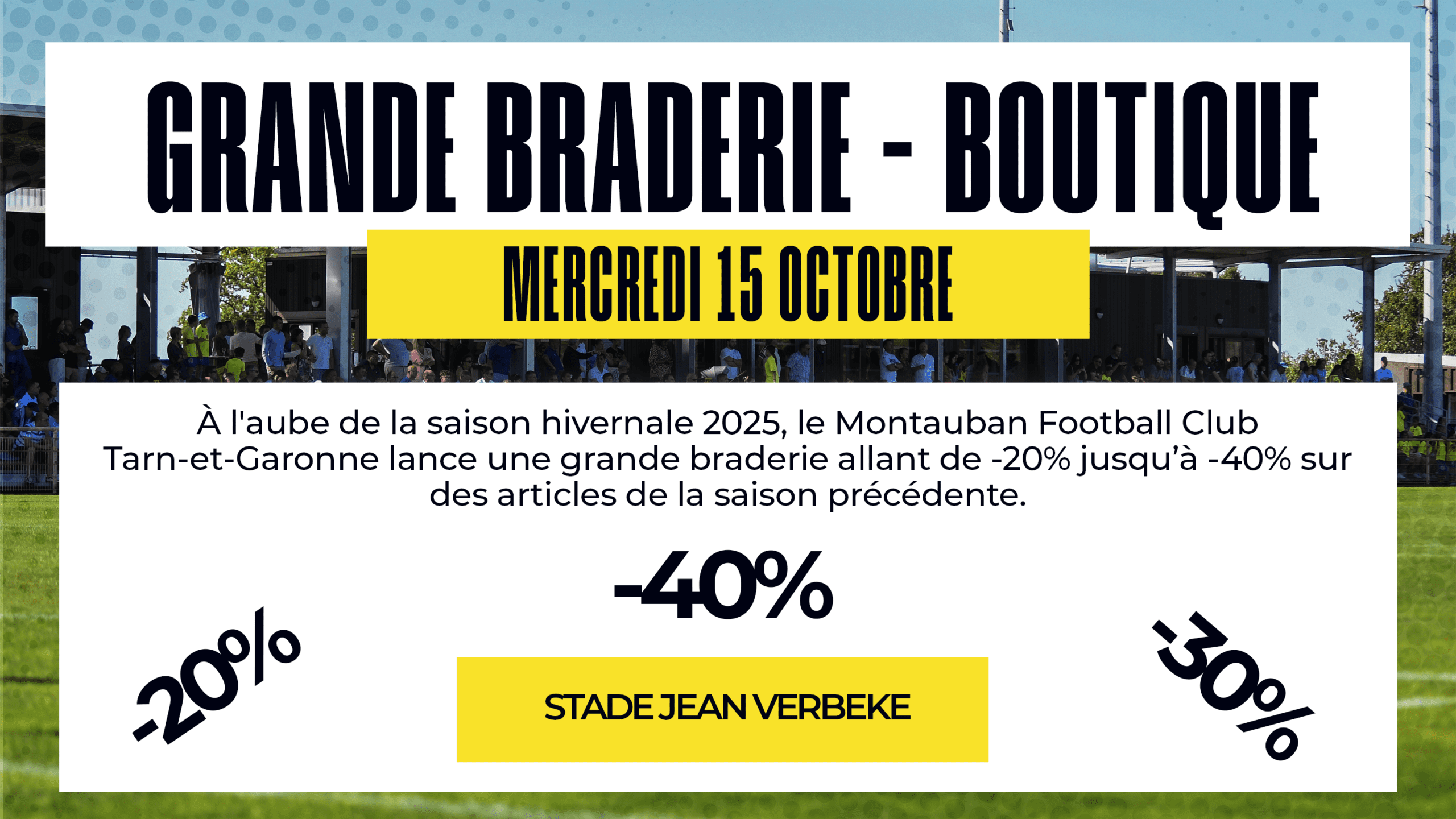 À l’aube de la saison hivernale 2025, le Montauban Football Club Tarn-et-Garonne lance la grande braderie sur des articles de la saison précédente. C’est l’occasion idéale de profiter de promotions allant de -20% jusqu’à -40% sur une large sélection d’articles de la saison passée. Tenues, équipements, accessoires… venez faire de bonnes affaires tout en représentant fièrement les couleurs du club.