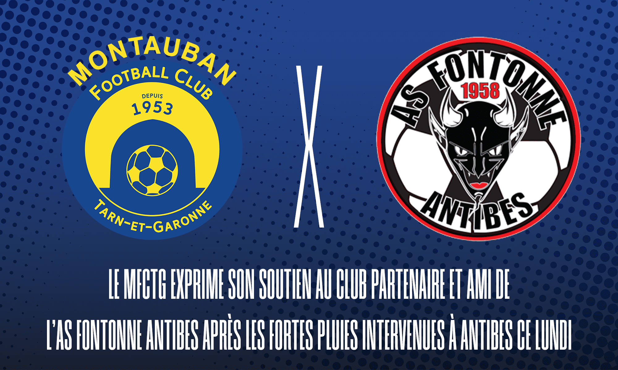 Le Montauban Football Club Tarn-et-Garonne tient à exprimer son soutien au club partenaire et ami de l’AS Fontonne Antibes après les fortes pluies intervenues dans la région d’Antibes ce lundi.