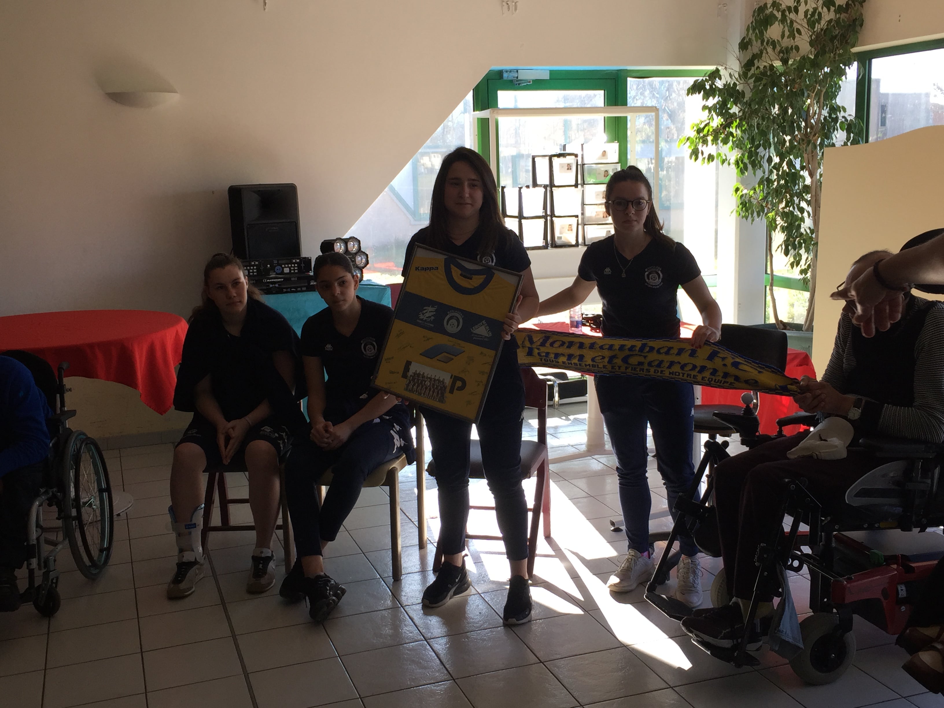 Comme symbole de notre échange, nos filles ont remis un maillot dédicacé par les joueuses de la D2 Féminine aux personnes accueillies. Pour les fervents supporters, nous leur avons également remis une écharpe en guise de souvenirs mais aussi à porter les jours de matchs du MFCTG !!