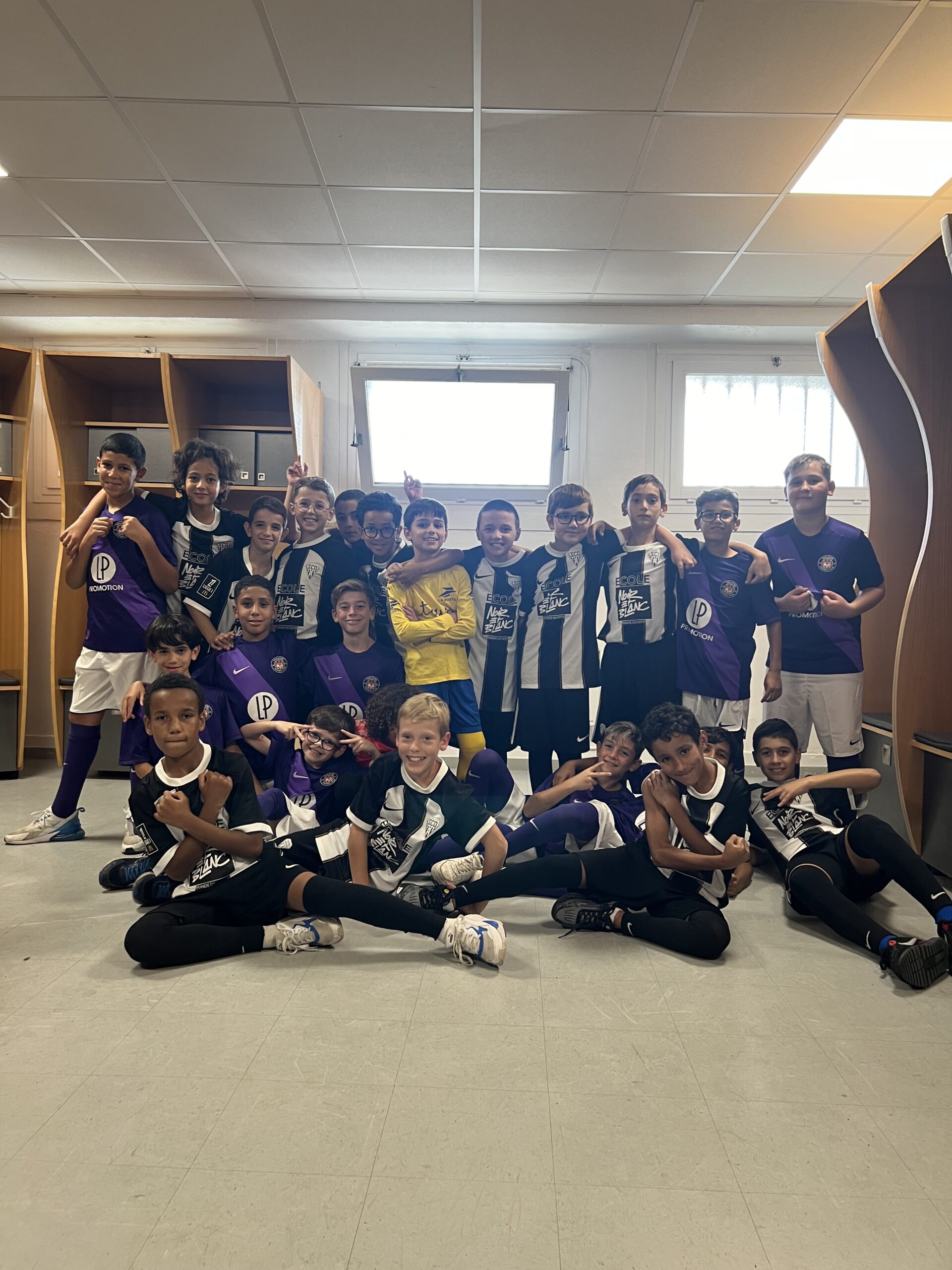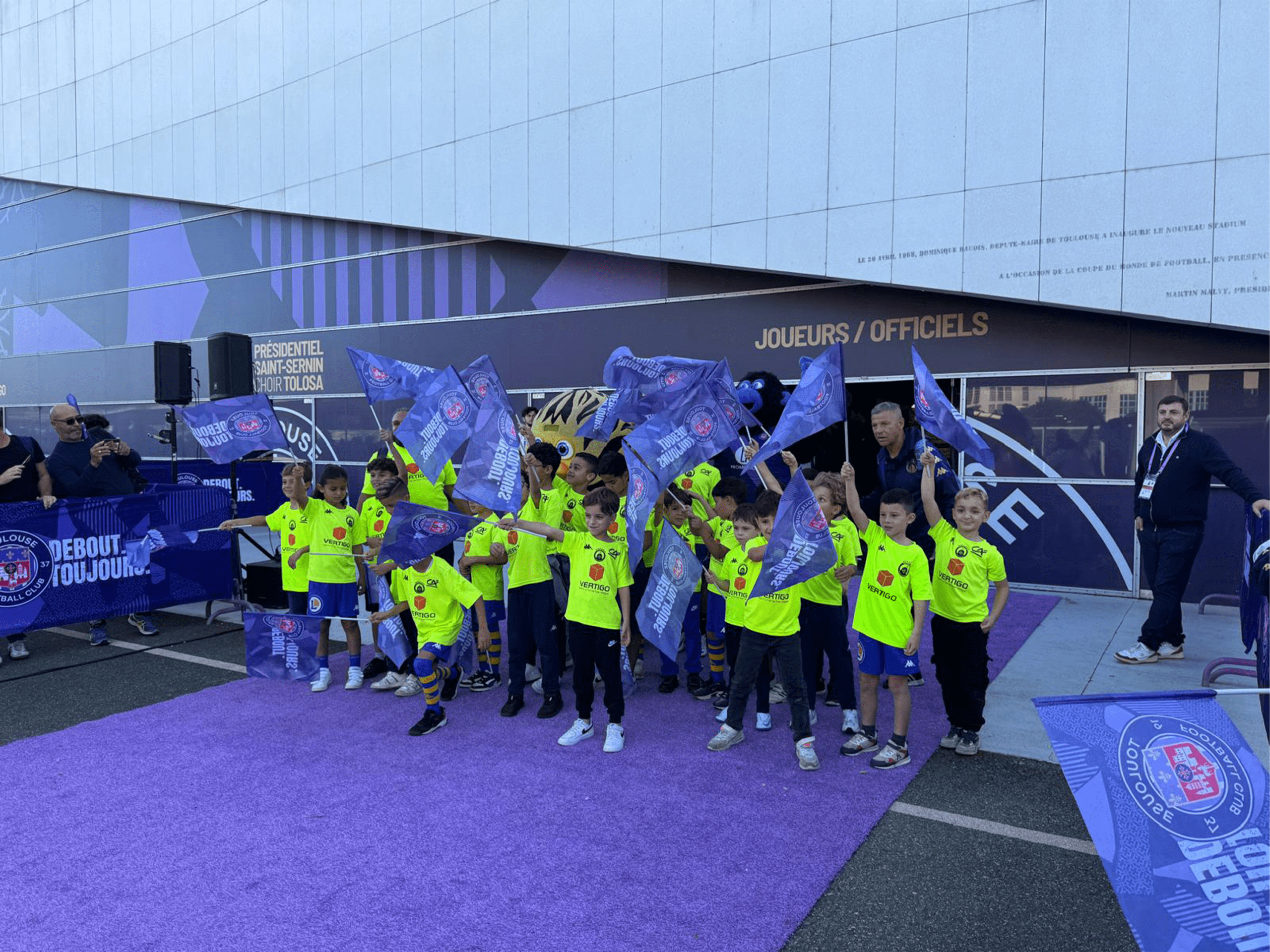 - Ainsi, les U8G ont pu être aux premières loges lors de l’arrivée des bus des 2 équipes et faire l’animation équipés de leurs drapeaux violets.